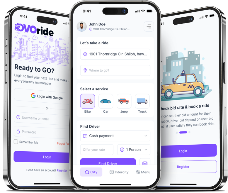 Riders enter their trip details, and drivers submit competitive bids. Riders can compare offers based on price and ratings.